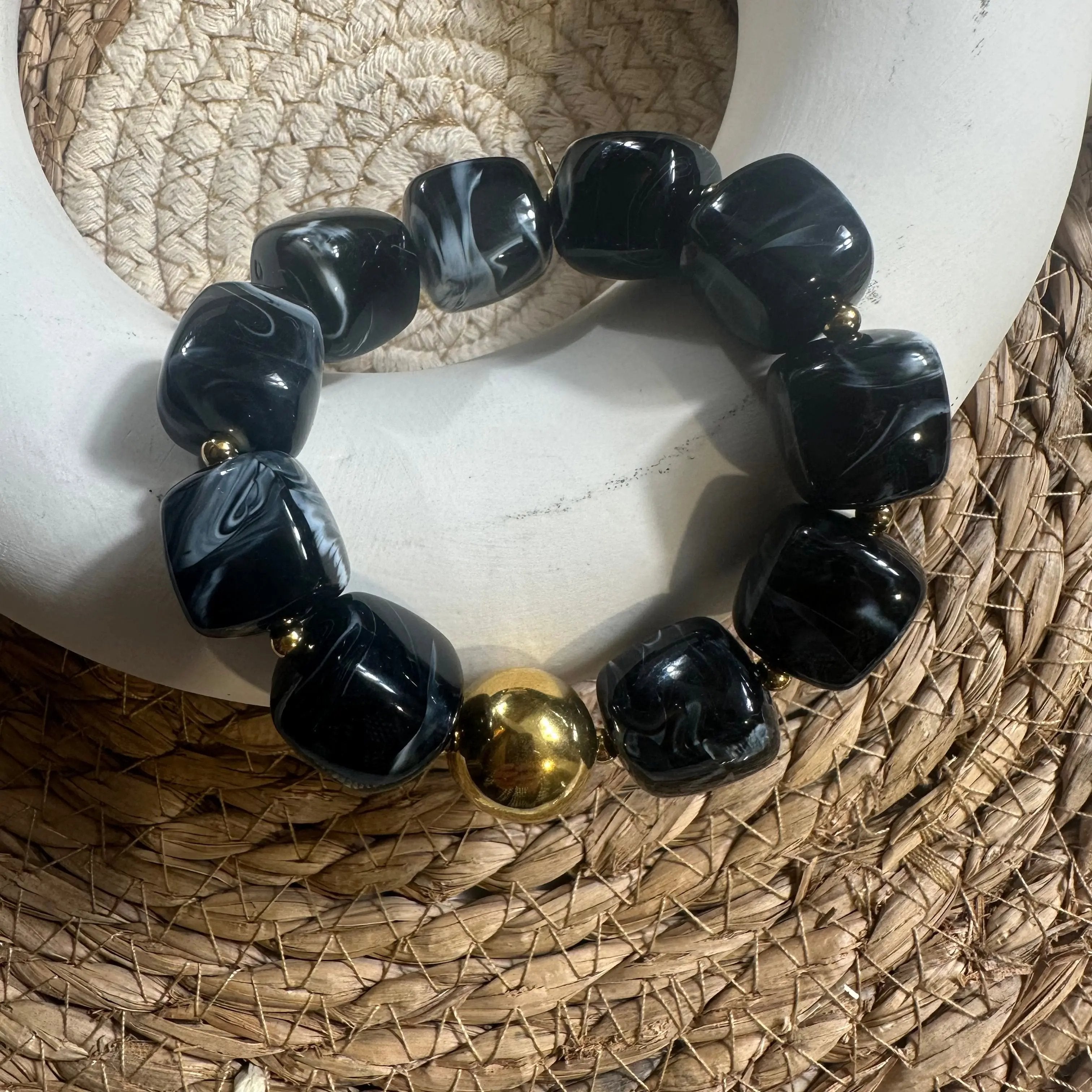 Composé de grosses pierres en résine, ce bracelet associe l’éclat du minéral à la légèreté de la matière. Son système élastique permet un ajustement parfait à tous les poignets, pour un confort optimal au quotidien.