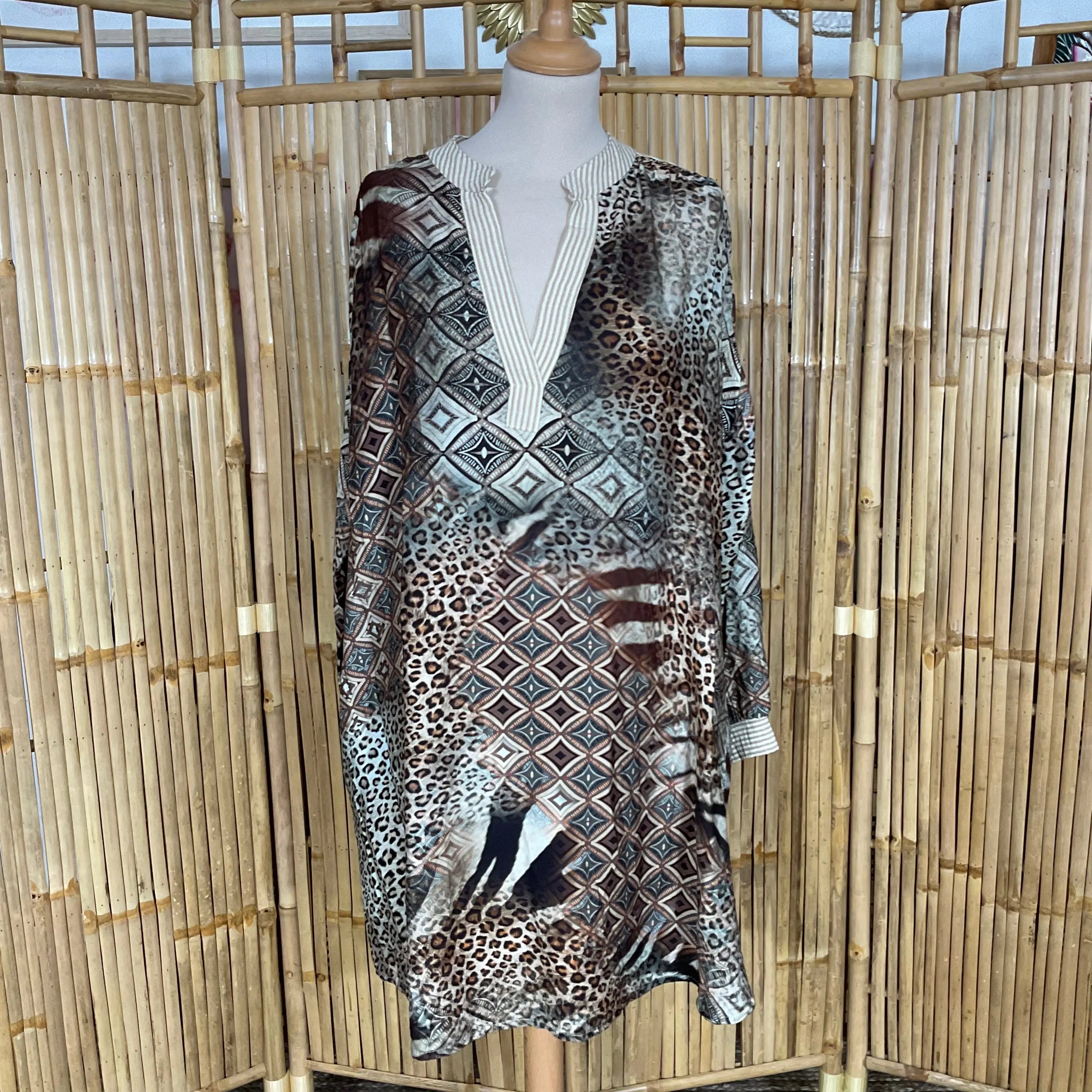 Cette robe fluide en viscose allie avec finesse imprimé bohème et col rayé contrasté, pour un look original, structuré et féminin. Sa coupe confortable et sa matière légère en font une pièce idéale à porter en journée comme en soirée.