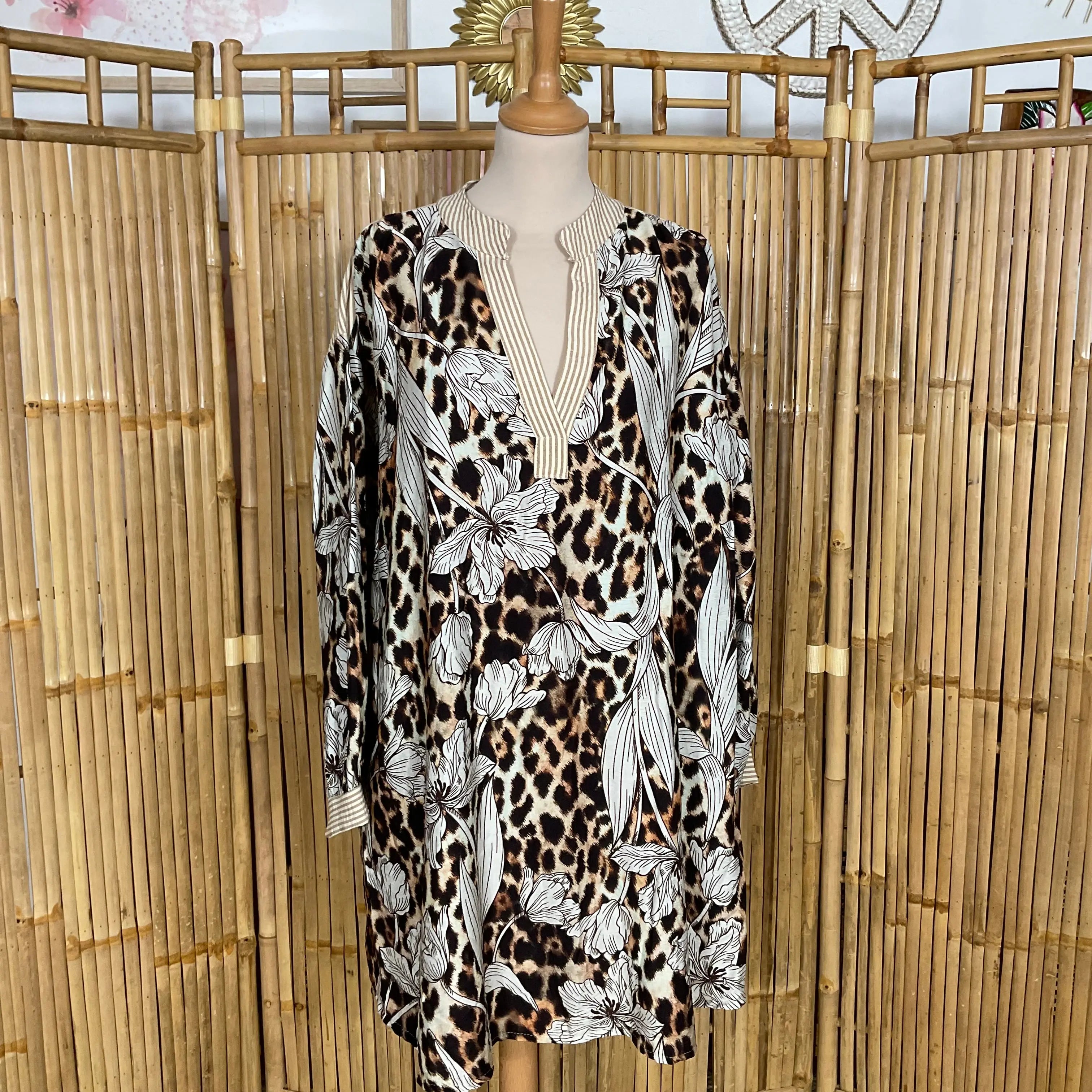 Le col rayé, détail fort et graphique, vient sublimer l’imprimé principal de la robe. Le résultat : une pièce au caractère affirmé, qui conserve toute la douceur d’un tissu fluide et naturel en 100 % viscose.